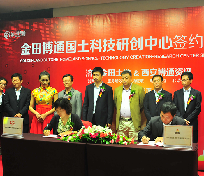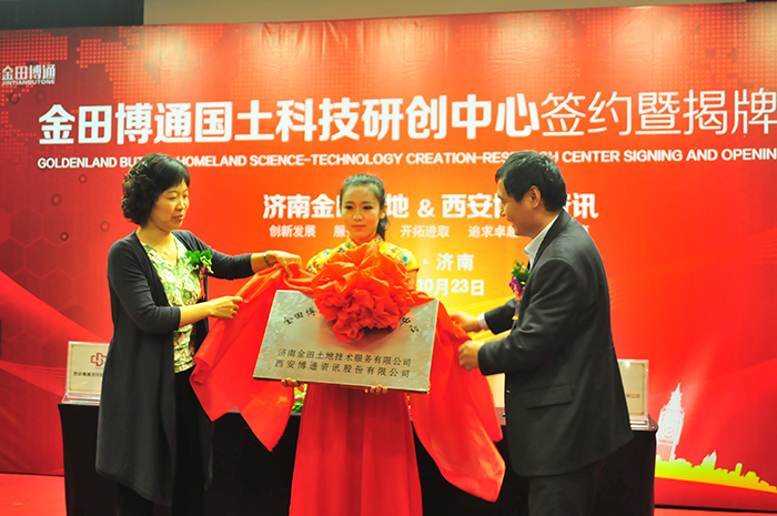 濟(jì)南金田土地技術(shù)服務(wù)有限公司和西安交大博通資訊股份有限公司合作簽約儀式,暨金田博通國土科技研創(chuàng)中心揭牌儀式于2014年10月23日舉行。