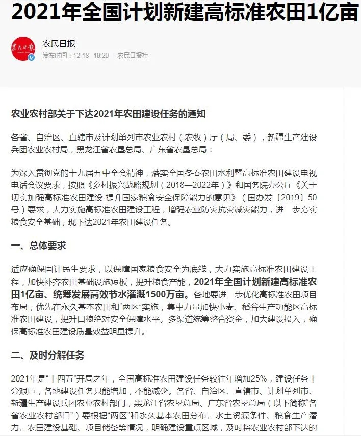12月13日,農(nóng)業(yè)農(nóng)村部印發(fā)了《關(guān)于下達(dá)2021年農(nóng)田建設(shè)任務(wù)的通知》。《通知》提出,2021年全國計(jì)劃新建高標(biāo)準(zhǔn)農(nóng)田1億畝,統(tǒng)籌發(fā)展高效節(jié)水灌溉1500萬畝。全國高標(biāo)準(zhǔn)農(nóng)田建設(shè)任務(wù)較往年增加25%。其中,山東需新建高標(biāo)準(zhǔn)農(nóng)田620萬畝(高效節(jié)水灌溉面積166萬畝),青島需新建高標(biāo)準(zhǔn)農(nóng)田34萬畝(高效節(jié)水灌溉面積4萬畝),分別比去年增加111萬畝、1萬畝。